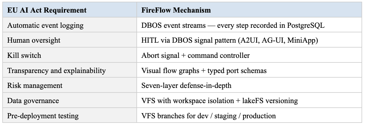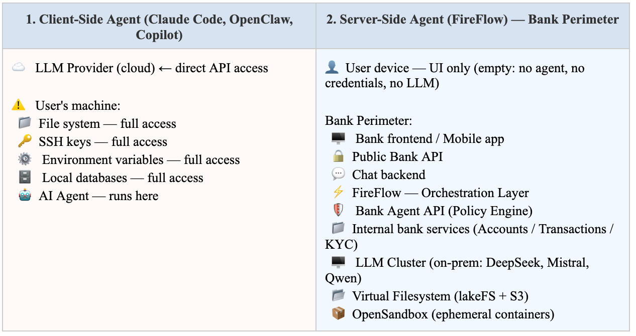 In client-side agents (Claude Code, Copilot), data is sent to the LLM directly from the user’s machine. The organization cannot insert a PII filter between the user and the LLM provider — it has no control over that channel. In FireFlow, all LLM calls pass through the execution engine inside the bank’s perimeter. This is the only point through which data reaches the LLM — and at this point, anonymization can be guaranteed.