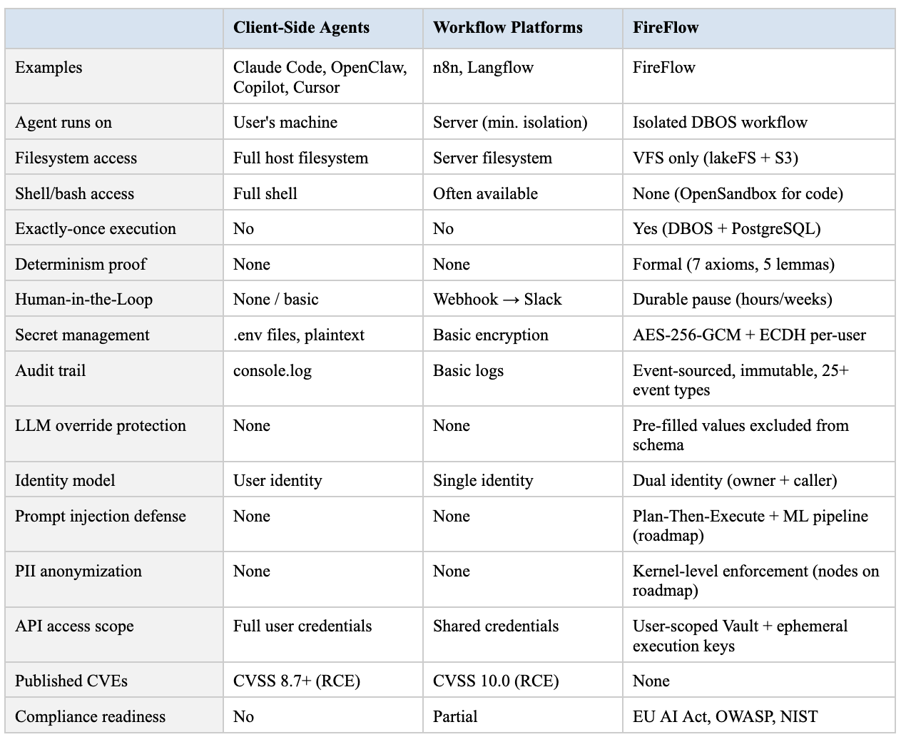 In the Client-Side model, a compromised agent equals a compromised machine. In FireFlow’s Server-Side model, a compromised agent is contained within an isolated execution sandbox with no access to user devices, host systems, or unscoped resources.