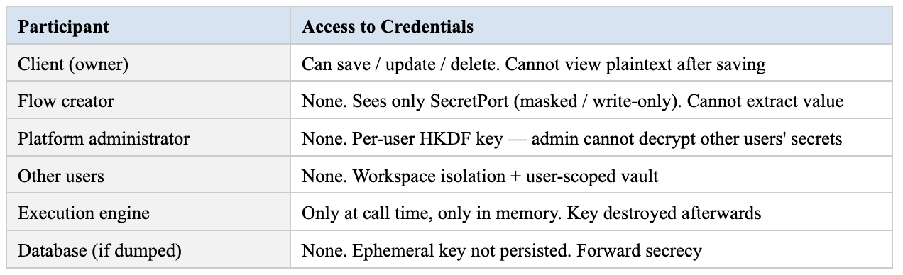 → Forward secrecy: even full DB dump cannot decrypt past executionsWho does NOT have access to customer credentials: